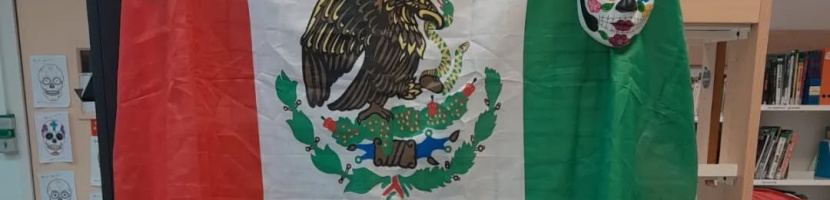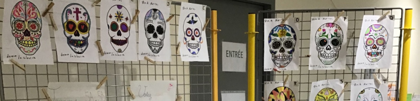 Emblématiques du jour des morts et de la culture mexicaine, les élèves de 5A et 5B ont dessiné des « Calaveras » ou Têtes de mort lors d’un cours sur El dia de Muertos - La fête des morts- Elles sont exposées au sein du collège. Beau travail !