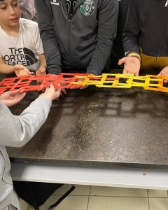 En attendant le retour de l’informatique les élèves font des ponts auto-portant de Leonard de Vinci avec l’incroyable Mme Galerne !